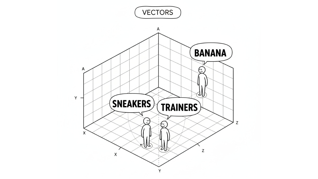 In our clothing store the word sneakers and the word trainers will have vectors that are very close to each other.