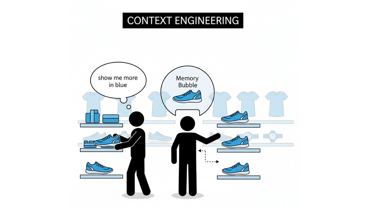 If a user has been looking at running shoes for ten minutes and then says show me more in blue context engineering ensures the system knows more refers to running shoes and not blue shirts or blue watches, which might also be in the store.