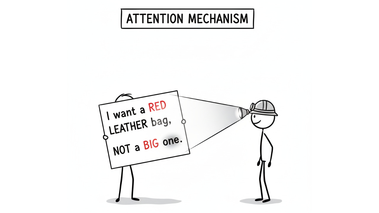 When a user says I want a red leather bag but not a big one the attention mechanism helps the model focus on red and leather for the style but gives high importance to not and big to ensure it does not suggest large items.