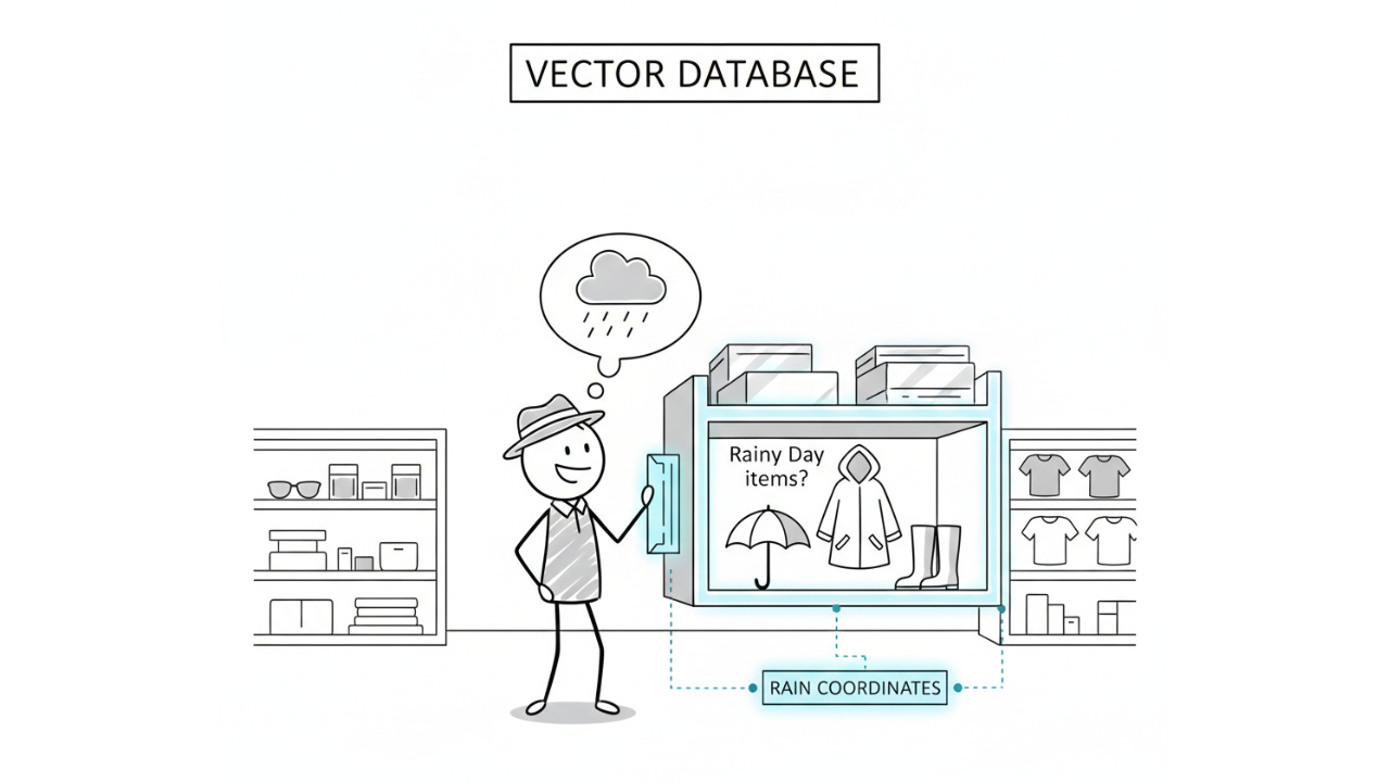 For example, we store our entire product catalogue in a vector database. If a user asks for something for a rainy day, the database finds items like umbrellas and raincoats because their vectors are mathematically related to rain, even if the word rain is not in every product title.
