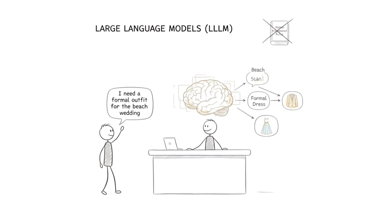 When a user types I need a formal outfit for a beach wedding the model understands the intent and the specific context of both formal and beach without needing a human to program every possible combination of those words.