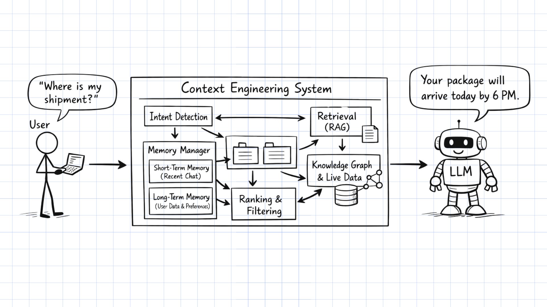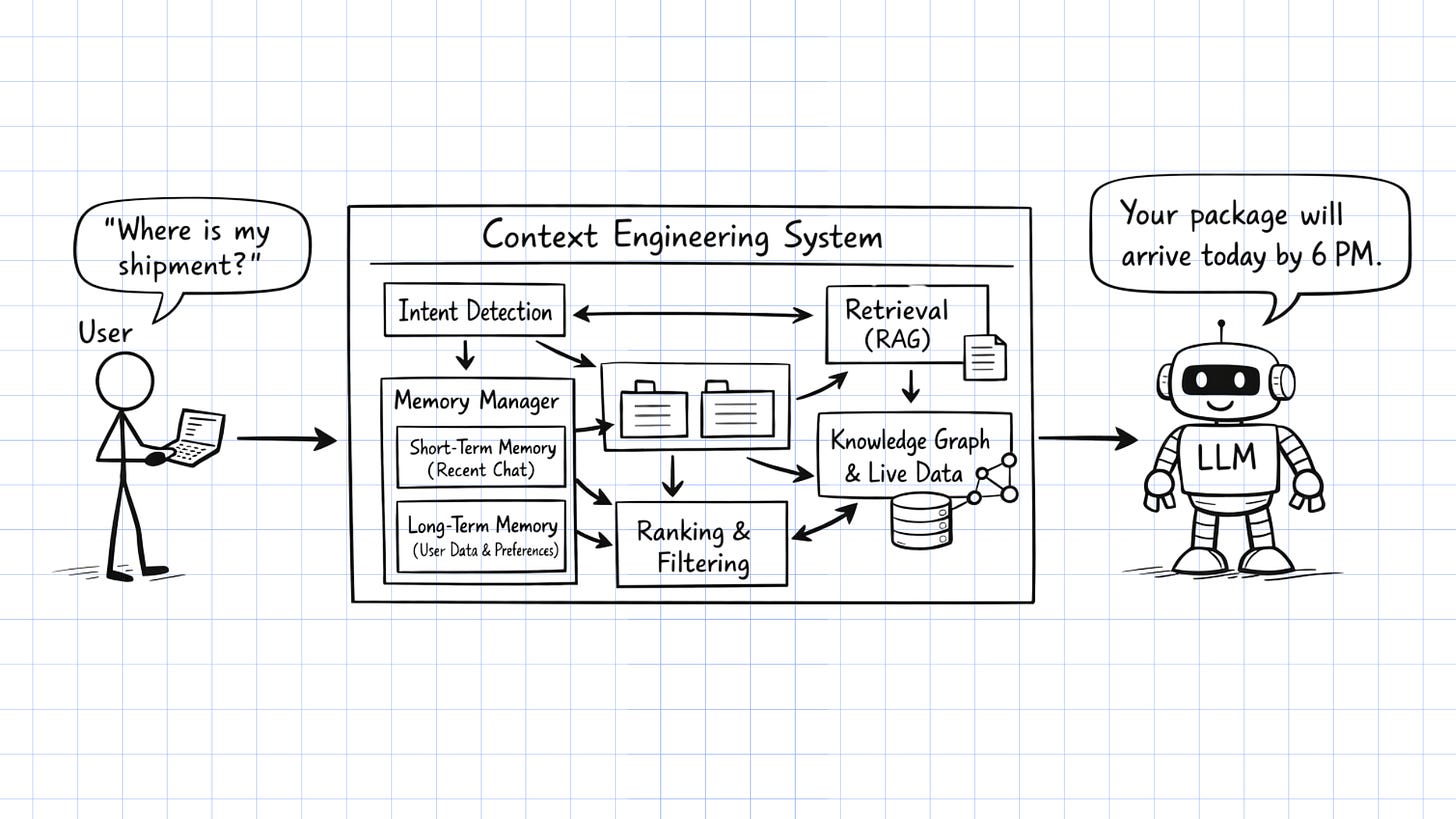 In our shipment example context engineering is the system that automatically pulls the tracking ID from the database and hands it to the AI before the AI even starts typing.