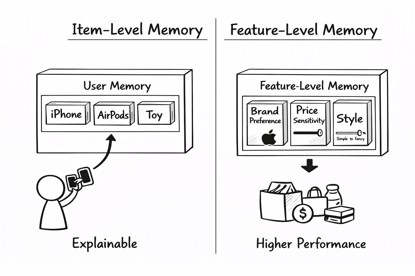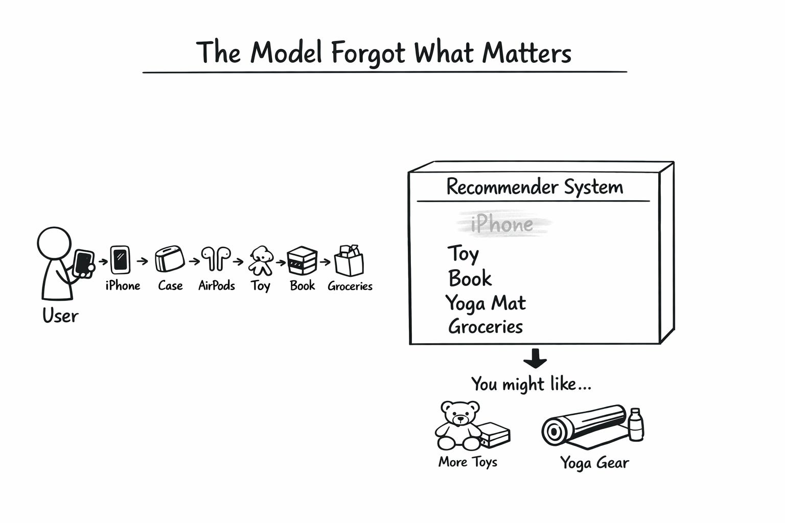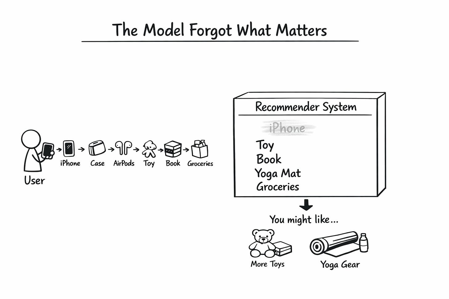 The first cost is performance. Your model misses the highest-signal moments in a user’s journey because they get washed out by noise. A user who bought an iPhone three weeks ago is an obvious candidate for iPhone accessories. Your model does not see it. Your revenue per user suffers.