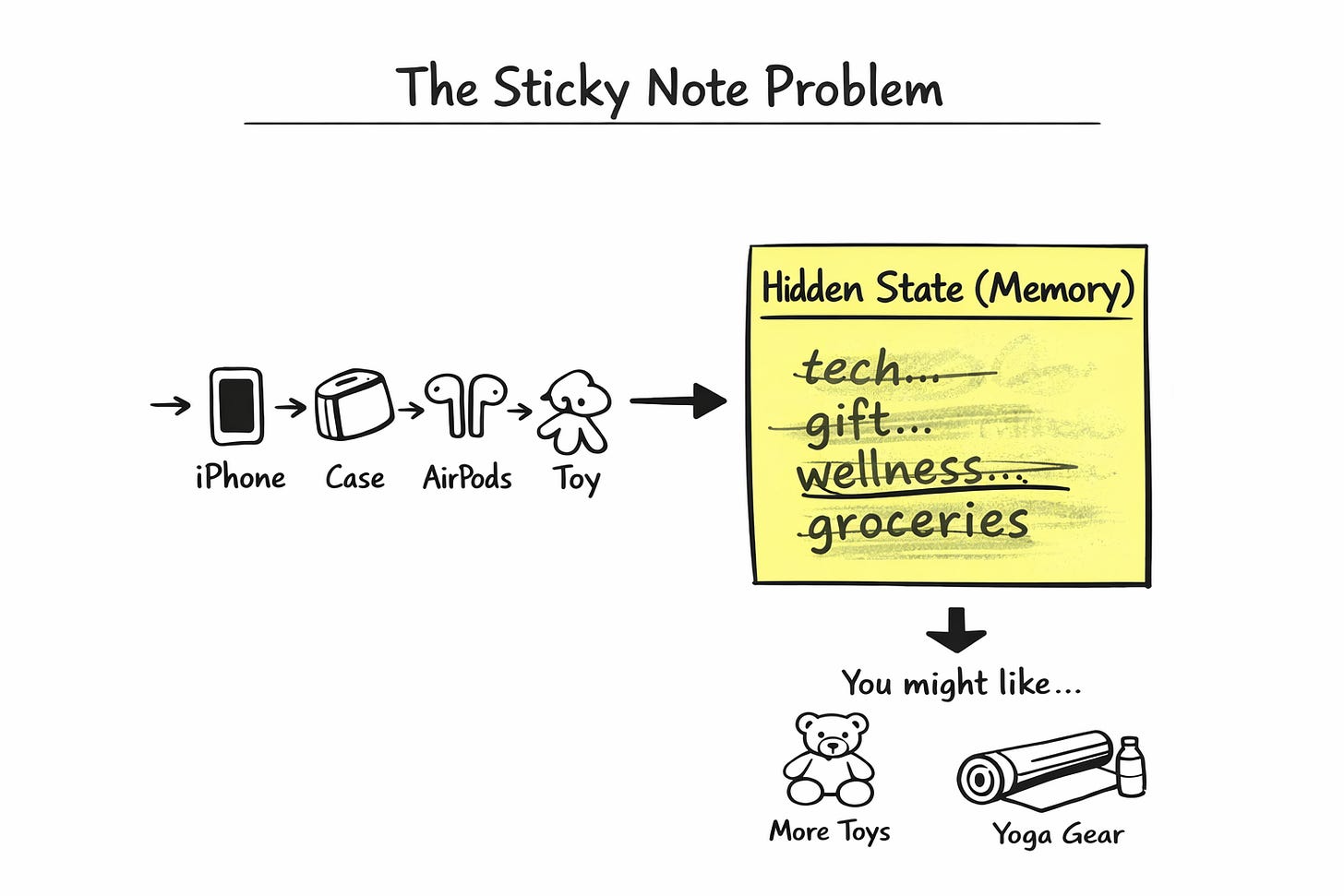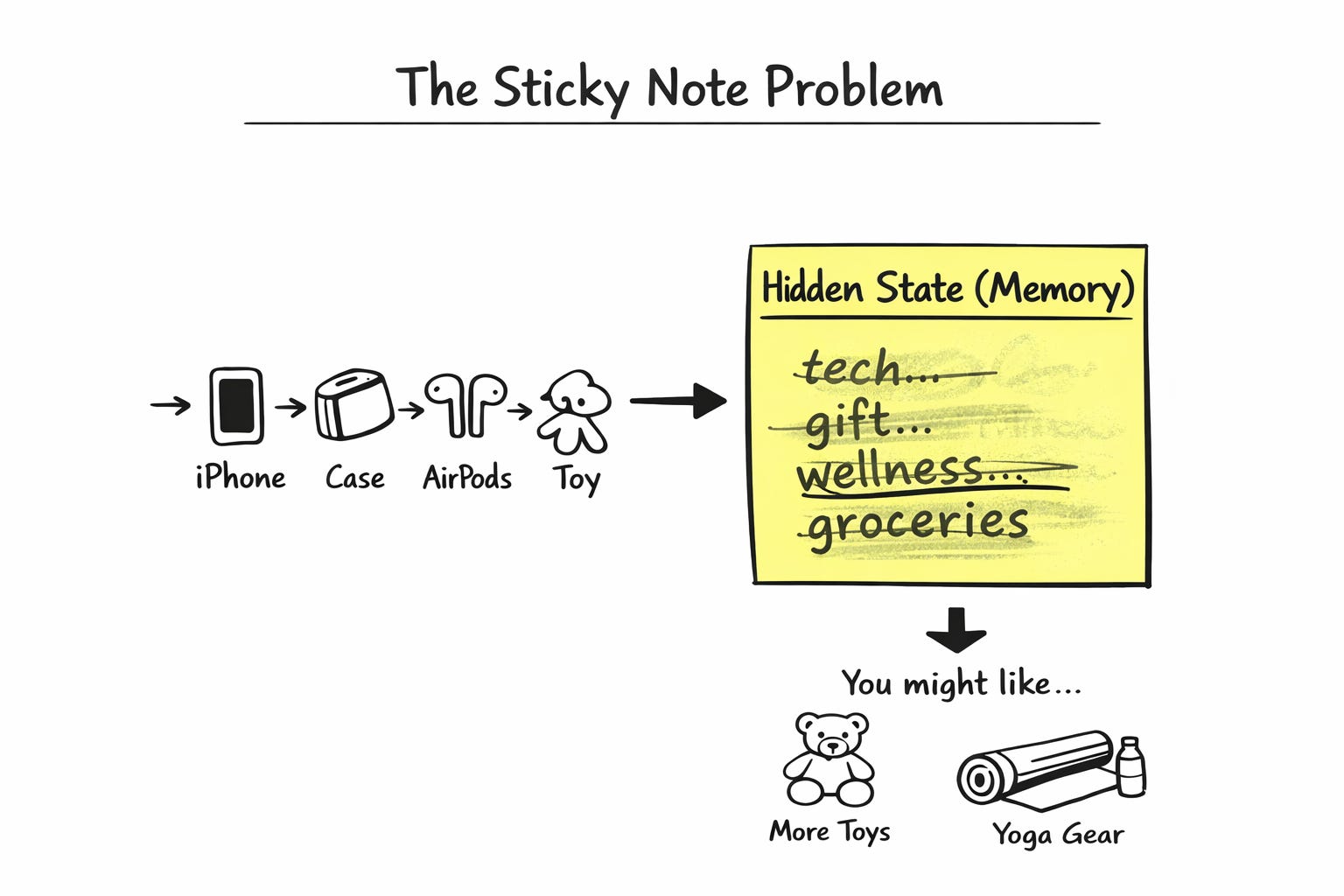 Think of the hidden state like a single sticky note. Every time you buy something, the model scribbles on that same note, and whatever was written before gets slightly smudged.