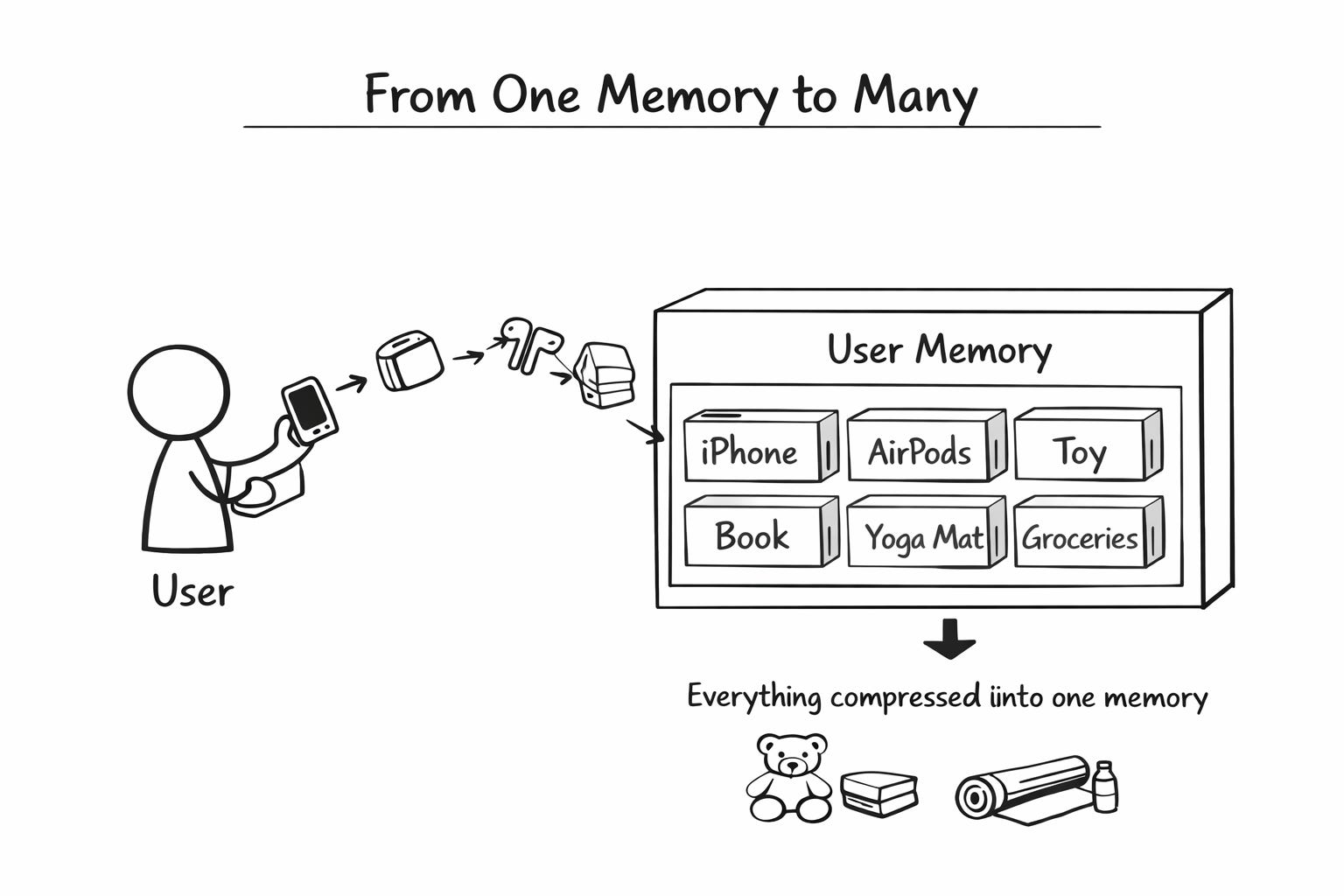 The mental model is simple. Every time you buy something, the relevant drawers in your memory box get a small dusting-off followed by a small update.